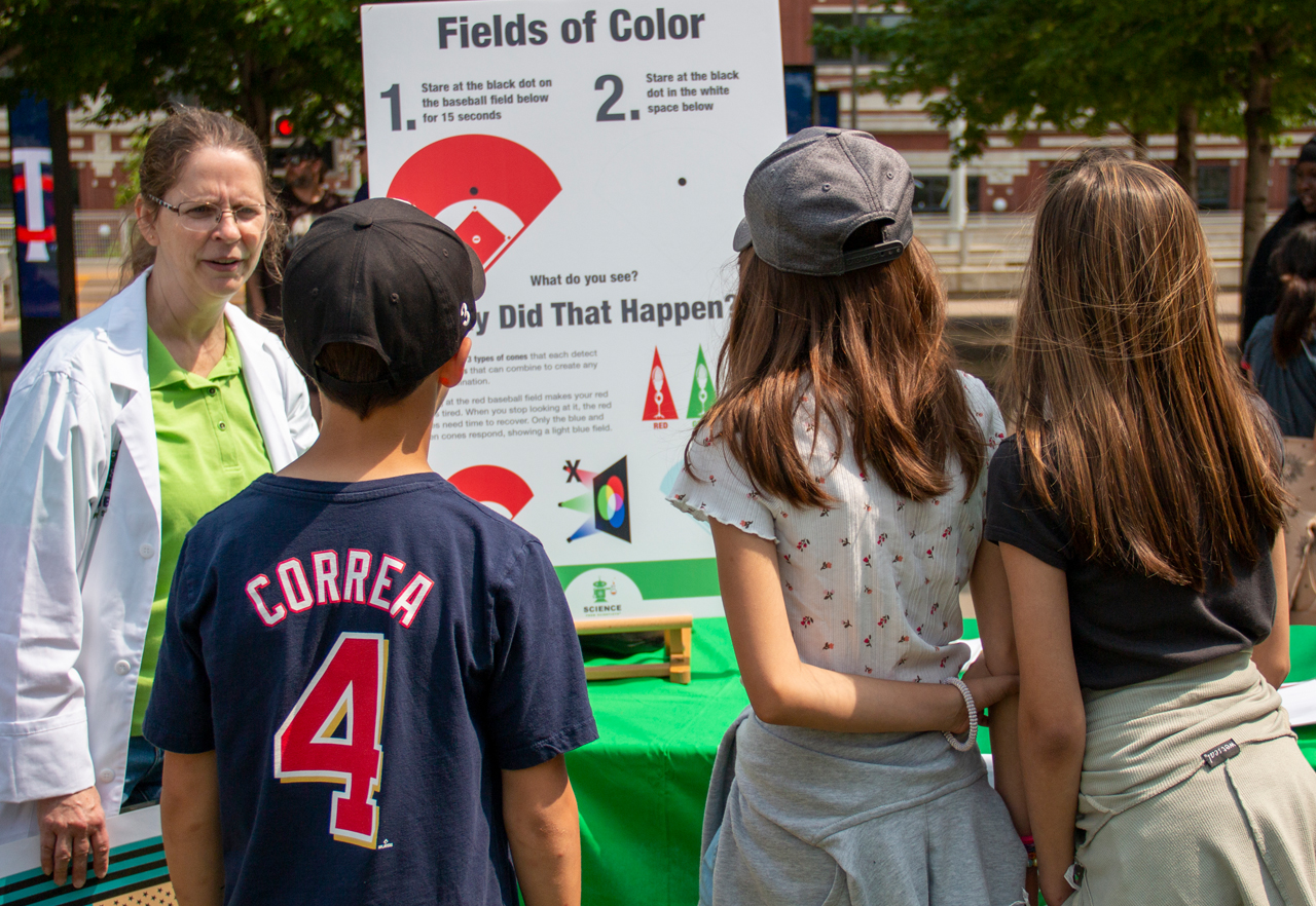 SciSci was one of the featured experiences at Minnesota Twins’ 2023 amd 2024 STEM Day at Target Field. Over 500 youths and their families engaged in science experiences such as Pitcher Pick-off and Fields of Color, experiments that help explain how your vision works; Batting Practice, a bean-bag tossing experiment to demonstrate your neurons at work after shifting your vision through prism goggles; and Beat the Pros, an experiment to test your reaction time and see how it compares to pro athletes.