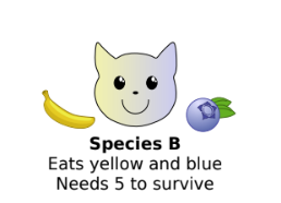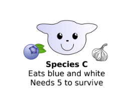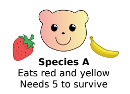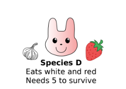 Each species needs 5 food points to survive each year. Your goal is to keep all species alive.